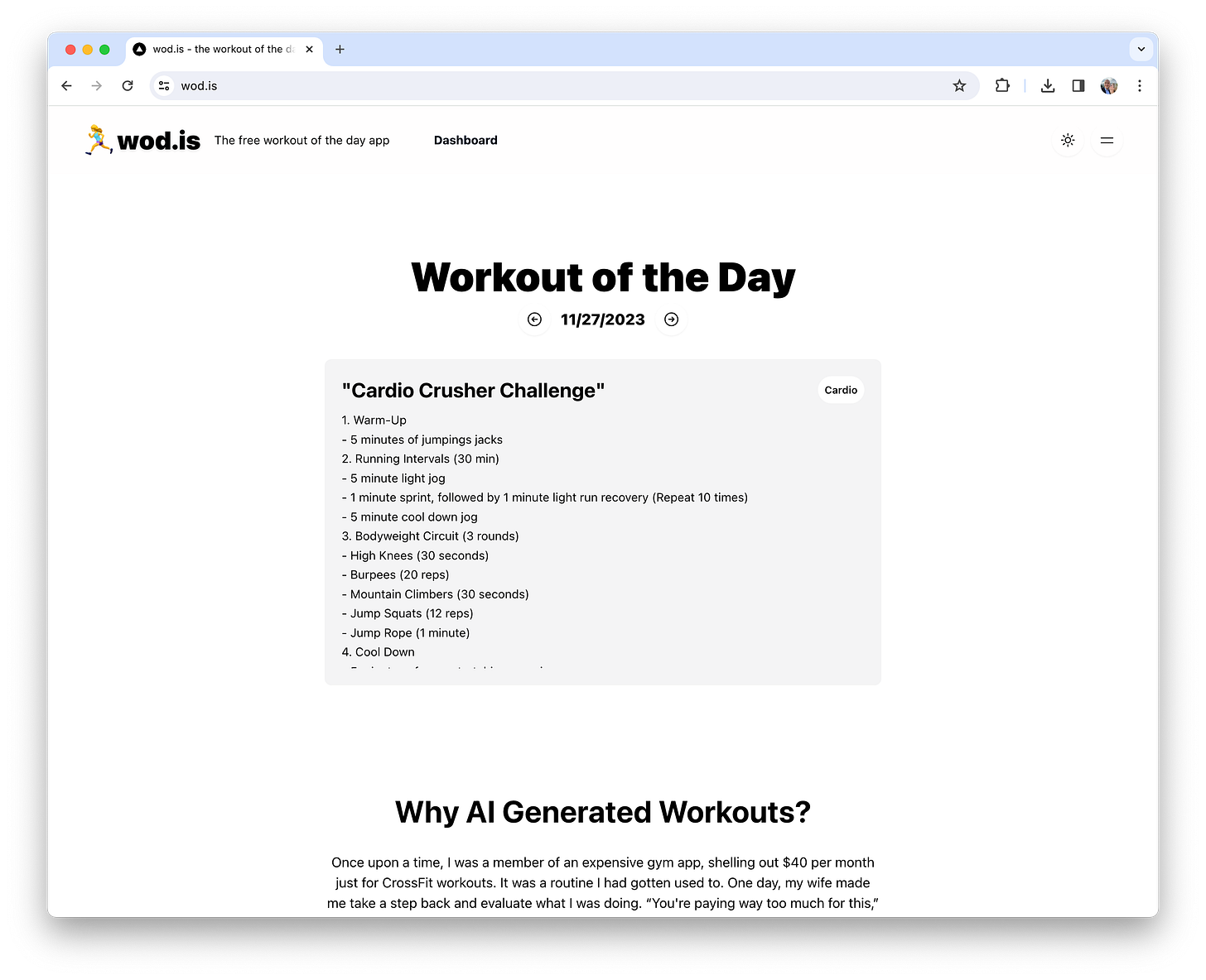 This weekend I added workout navigation to Wod.is. This feature displays the current day's workout and allow users to browse through past and upcoming workouts. I love when gyms do this on their websites, so I wanted to add it to Wod.is. Here's how it looks on the homepage: